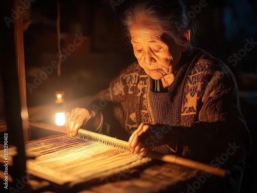 Elderly Roman matron skillfully weaving in the warm glow of a lamp during a quiet evening at home. Generative AI