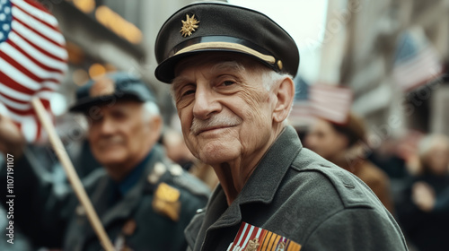 Elderly veterans wearing military uniforms and medals participating in a parade with American flags in the background