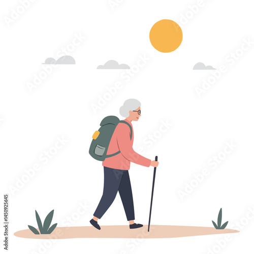 Elderly woman on hiking path - vibrant senior woman walking forest, radiating joy and love for nature.