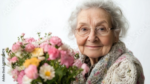 Elderly woman with a walking stick, friendly expression, dressed simply, looking directly at the camera, white background