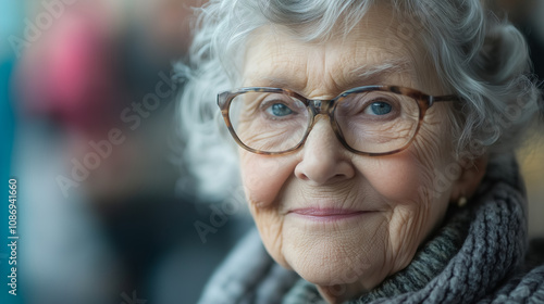 Elderly woman with silver hair and glasses smiling warmly while sitting indoors in a cozy setting during the afternoon. Generative AI