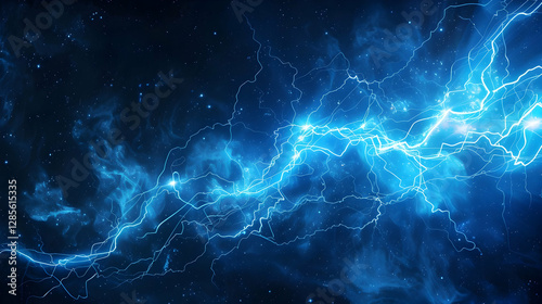 Electric blue lightning bolts illuminate a dark cosmic background with swirling clouds