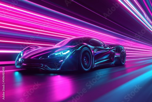 Electric car charging at futuristic station with vibrant neon lights, An electric cars that are charged from a station Futuristic sports car on colorful light highway