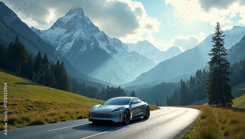 Electric Car on Mountain Road: A sleek, silver electric car glides along a winding mountain road, showcasing the beauty of nature and modern transportation.