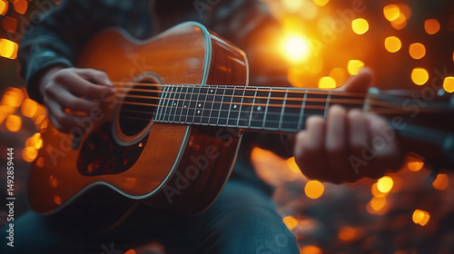 Electric guitar close-up with musician’s hands on the fretboard and space for text