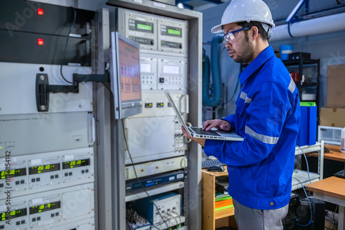 Electrical engineer male checking voltage at the Power Distribution Cabinet in the control room,preventive maintenance Yearly,inspecting power system and control panel in industrial factory