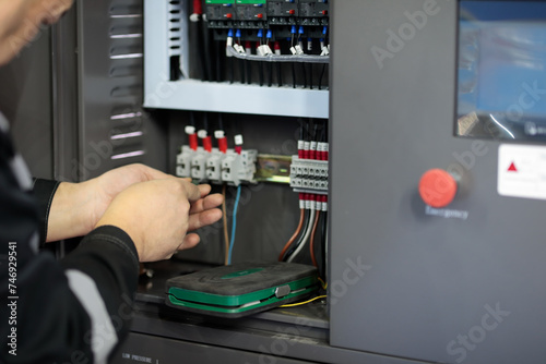 electrician connecting wires in control cabinet