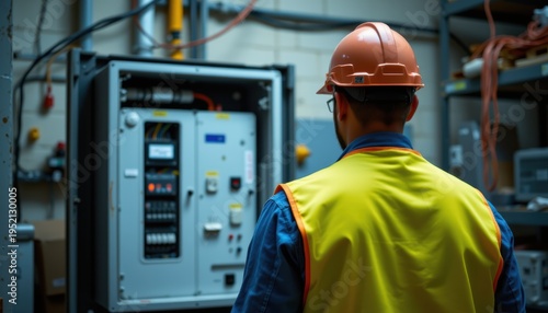Electrician inspecting control panel in an industrial setting wearing safety gear.