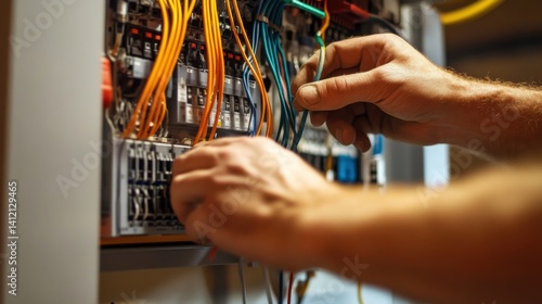 Electrician installing wiring inside an electrical panel. Featuring electrical knowledge and safety