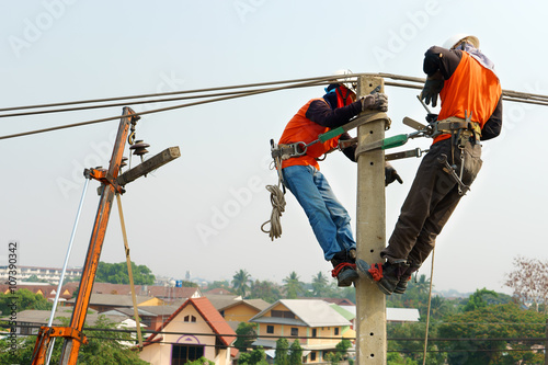 Electrician lineman repairman worker at climbing work on electric post power pole, Thai language same safty fist in English language