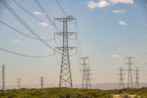 Electricity supply towers and structures transmit power along high voltage wires and cables