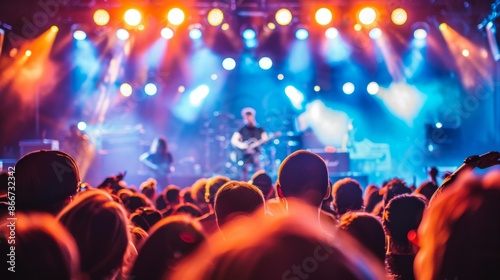Electrifying rock concert with diverse crowd; colorful stage lights illuminating fans applauding, musicians performing live; nighttime music festival atmosphere.