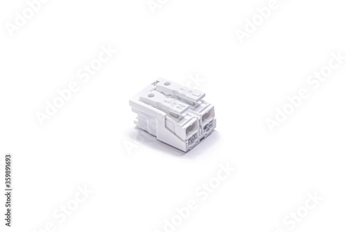 Electronic components. One compact splicing connector or terminal block isolated on white.