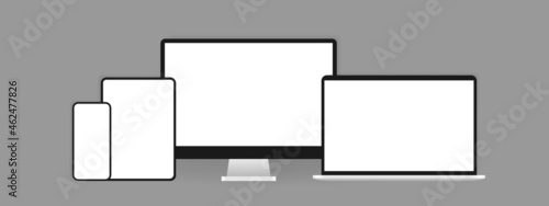 Electronic devices mockup set. Realistic computer, laptop, tablet and smartphone. Template for infographics or presentation UI design interface. Vector illustration