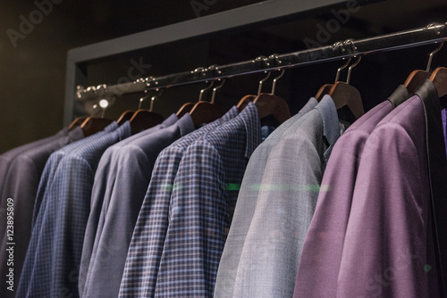 Elegant suits in a men clothing shop.