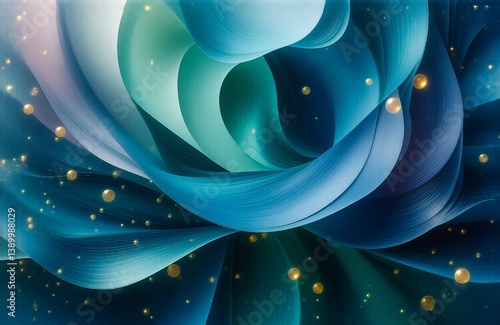 Elegant abstract design featuring swirling blue and green tones accented with shimmering golden spheres, creating a fluid, dreamy, and visually textured backdrop.