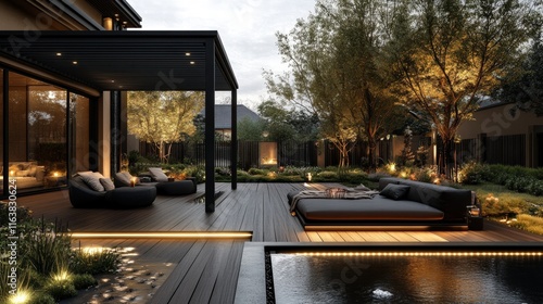Elegant and Lavish Outdoor Garden Design with Cozy Lounge Area and Ambient Lighting Set in Tranquil Environment