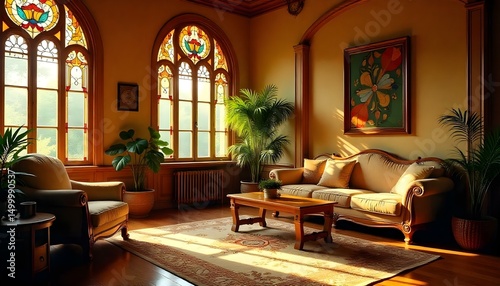 Elegant Art Nouveau living room with curved wooden furniture, floral motifs, and stained glass windows.
