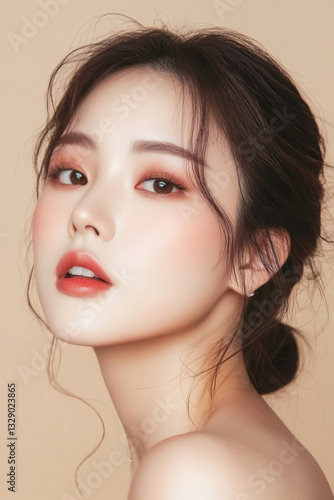 Elegant Asian Woman with Makeup and Luxurious Style on Beige Background