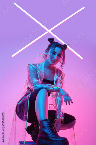 Elegant beautiful woman in a raincoat around colourful bright neon