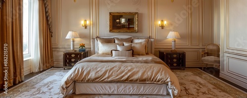 Elegant bedroom with custom millwork and luxurious bedding.