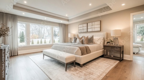 Elegant bedroom with natural light, neutral tones, and cozy accents