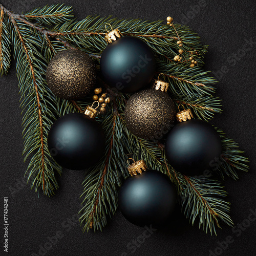 Elegant black and gold christmas ornaments arranged with fresh evergreen branches on a dark festive background.