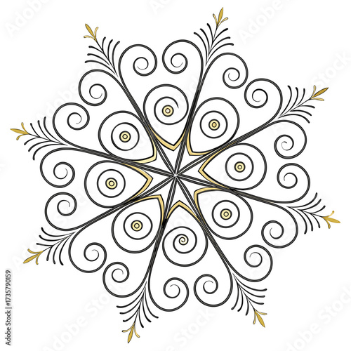 Elegant black and gold ornamental snowflake design with intricate swirls and floral elements