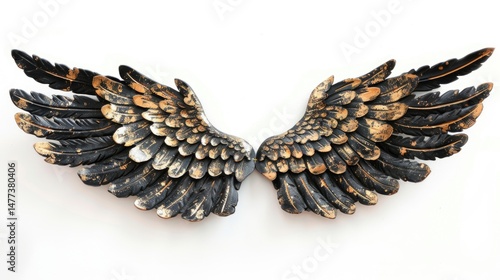 Elegant black and golden angel wings decor with textured finish on white background
