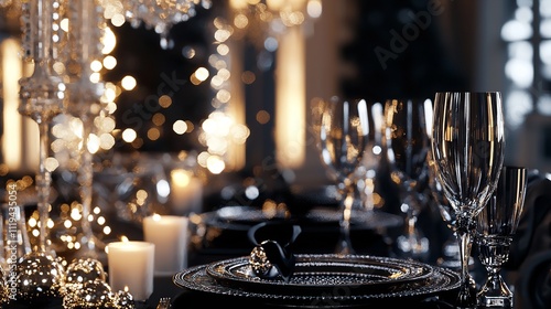 Elegant Black and Silver New Year's Eve Party Scene with Glamorous Decor