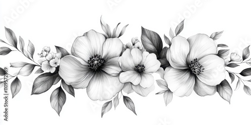 Elegant black and white floral arrangement featuring blooming flowers and delicate leaves in a serene and artistic style