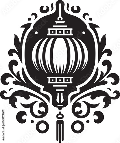 Elegant Black and White Lantern Design with Decorative Elements in a Detailed Illustration