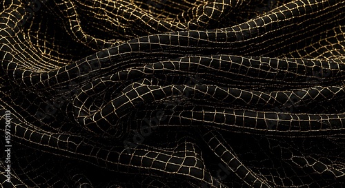 Elegant black fabric with shimmering gold grid pattern creating a luxurious texture experience
