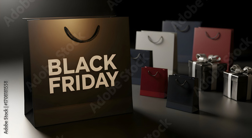 Elegant Black Friday shopping scene with gift boxes and shopping bags in various colors