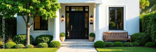 Elegant black front door, white house, lush green tree, wooden bench , aesthetic, photography
