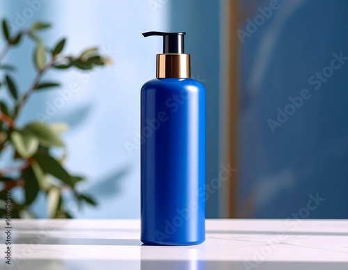 Elegant blue bottle with golden accents for premium skincare or beauty product presentation in modern setting