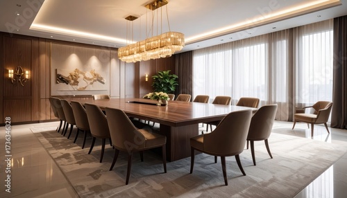 Elegant boardroom interior showcasing a large wooden table with leather chairs arranged for a meeting, complemented by a luxurious chandelier and natural light streaming through large windows,...