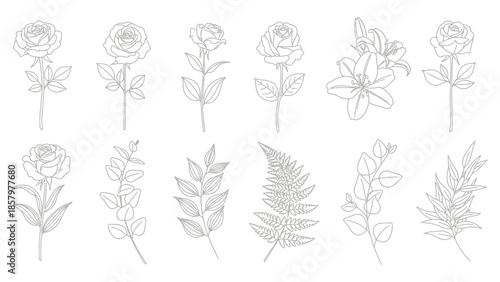 Elegant Botanical Line Art Collection of Various Flowers and Leaves.