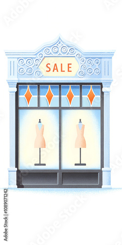 Elegant Boutique Storefront with Mannequins and Sale Sign Display