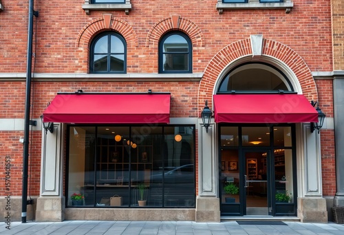 Elegant brick facade, arched windows, awning, boutique, facade, street