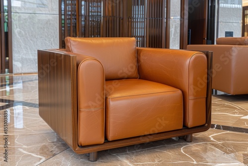 Elegant brown leather armchair in modern interior setting