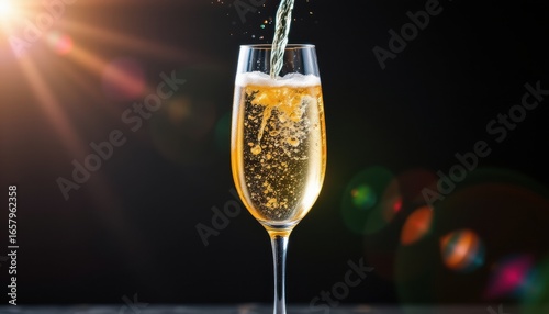 elegant champagne pouring into glass against dark background, subject at the bottom with copy space at the top, under sunlit sparkle, optimize this image for photo use