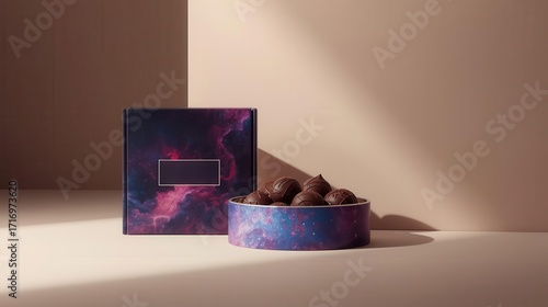 Elegant chocolate gift box with assorted truffles minimalistic setting studio photography soft lighting