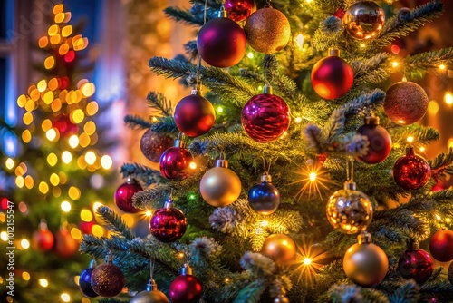Elegant Christmas Decorations with Ornaments, Lights, and a Beautifully Adorned Tree in Focus