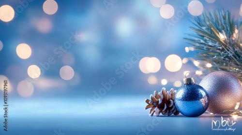 Elegant Christmas Still Life with Blue and Gold Ornaments, Pine Cone, and Soft Bokeh Background for Holiday Celebrations and Seasonal Decor