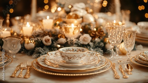Elegant Christmas table setting with candles, flowers, and fine china.