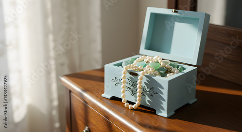 Elegant Cottage Jewelry Box Displaying Pearls and Sea Glass on Wooden Dresser