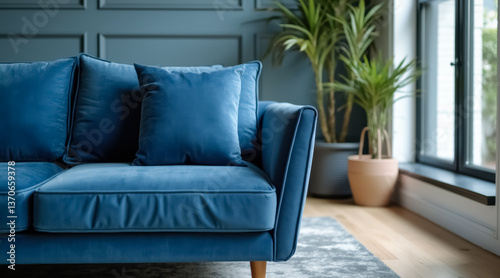 elegant deep blue velvet sofa with matching cushions