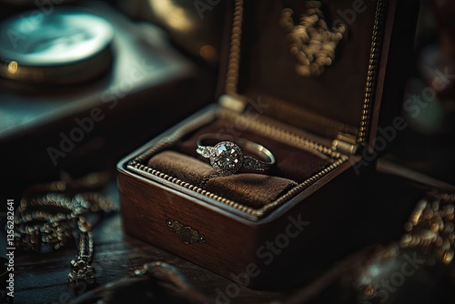 Elegant diamond ring nestled in a wooden box