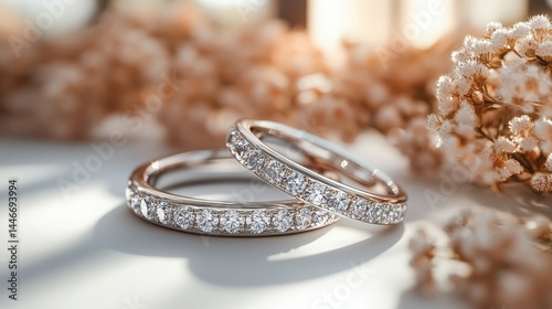 Elegant Diamond Wedding Rings and Soft Floral Accents in Warm Sunlight